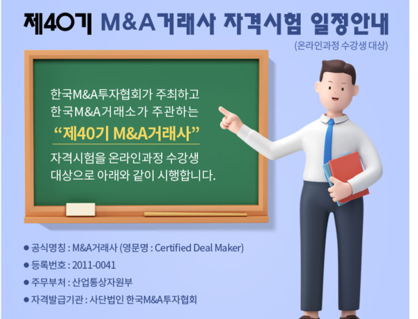 한국 M&A투자협회에서 주최하고 한국M&A거래소가 주관하는 M&A거래사 자격시험의 일정이 정해졌다.